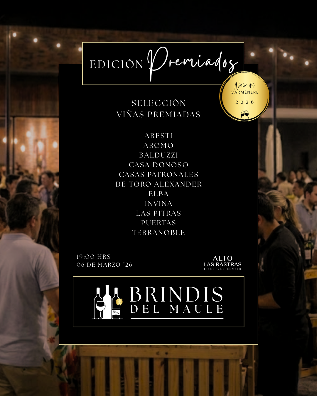 En esta ocasión se celebrarán los “Premiados Valle del Maule”, un encuentro íntimo entre público amante del vino y las viñas galardonadas en el reciente concurso de La Noche del Carmenere.